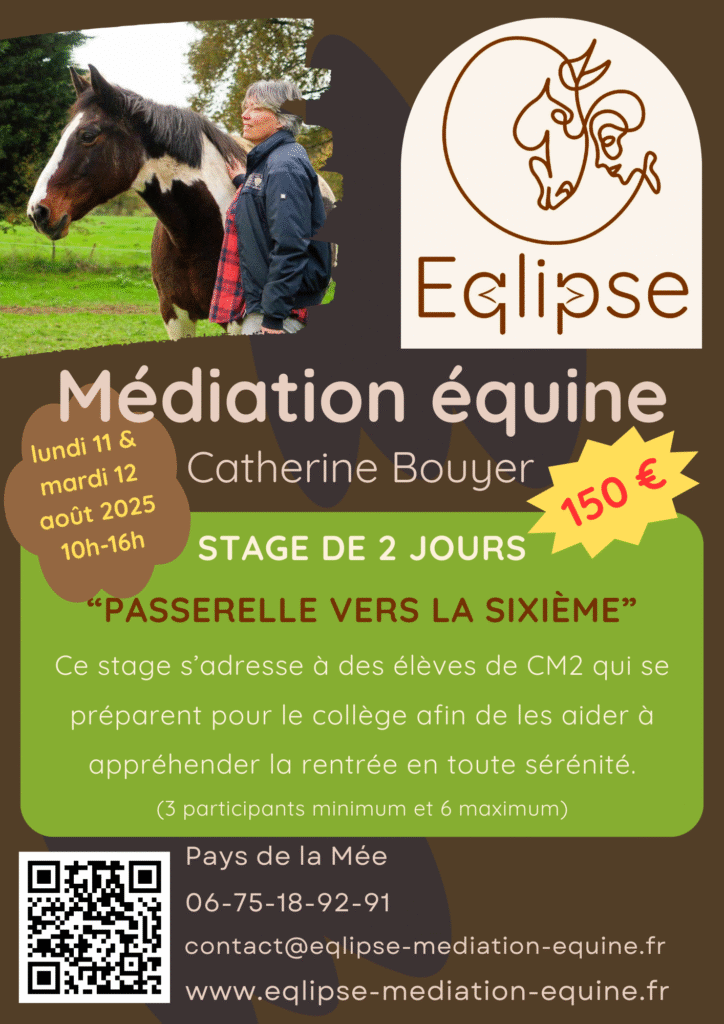 Ces stages de 2 jours (2 fois 6 heures) s’adressent à des élèves qui viennent de terminer l’école primaire et qui s’apprêtent à entrer au collège en 6è. Quand on quitte l’école, on est content de partir au collège parce que cela marque une étape dans la vie d’un enfant. On change de lieu, de personnes, de façon de travailler, d’organisation de la vie quotidienne… C’est nouveau et c’est chouette ! Mais ça peut aussi être source d’angoisses, d’appréhension, d’anxiété. Ces deux jours auprès des ânes et des chevaux offrent une parenthèse pendant les vacances, pour apprendre à s’apaiser, à prendre confiance en soi, à se projeter de manière positive vers une nouvelle étape de sa scolarité, et tout cela sous le regard bienveillant et sans jugement des chevaux. Grâce à eux, on apprend à mieux se connaître et on se découvre plein de qualités… Et finalement, on se rend compte qu’on est prêt…